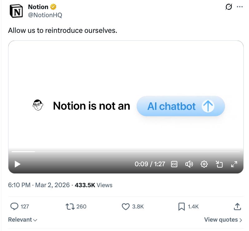 I have to say though, Notion’s reintroduction campaign is smart positioning. Instead of fighting purely over chat UX, it’s bidding to own the workspace layer.