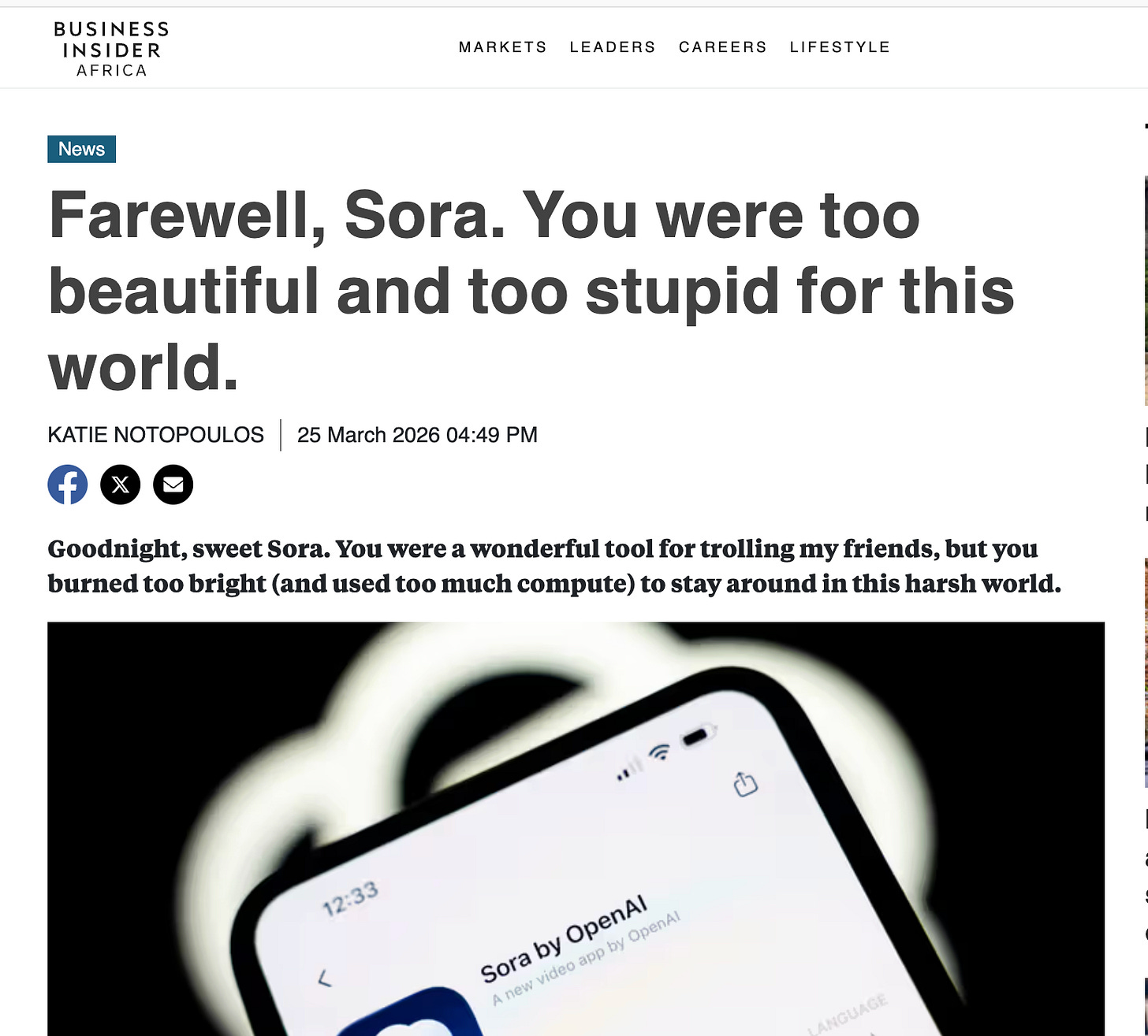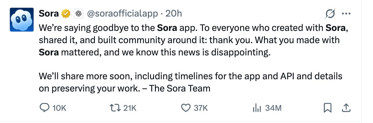 and this is a lesson for us. It’s not just that “one cool app is going away,” it’s that any shiny AI product, especially the demo‑driven ones, can be switched off by a spreadsheet somewhere. Today it’s video. Tomorrow it could be the API you quietly wired into three of your workflows. 😉